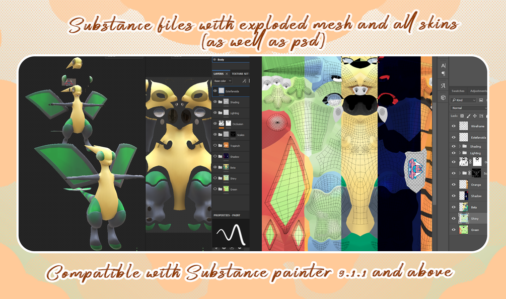 - 5 Skins: Green, Orange, Beta, Shiny and Shadow