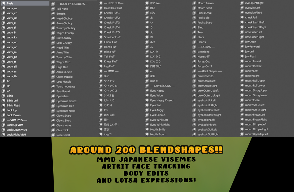 - 200 Blendshapes! (Body shapes, visemes, to hide fur, toggles etc)